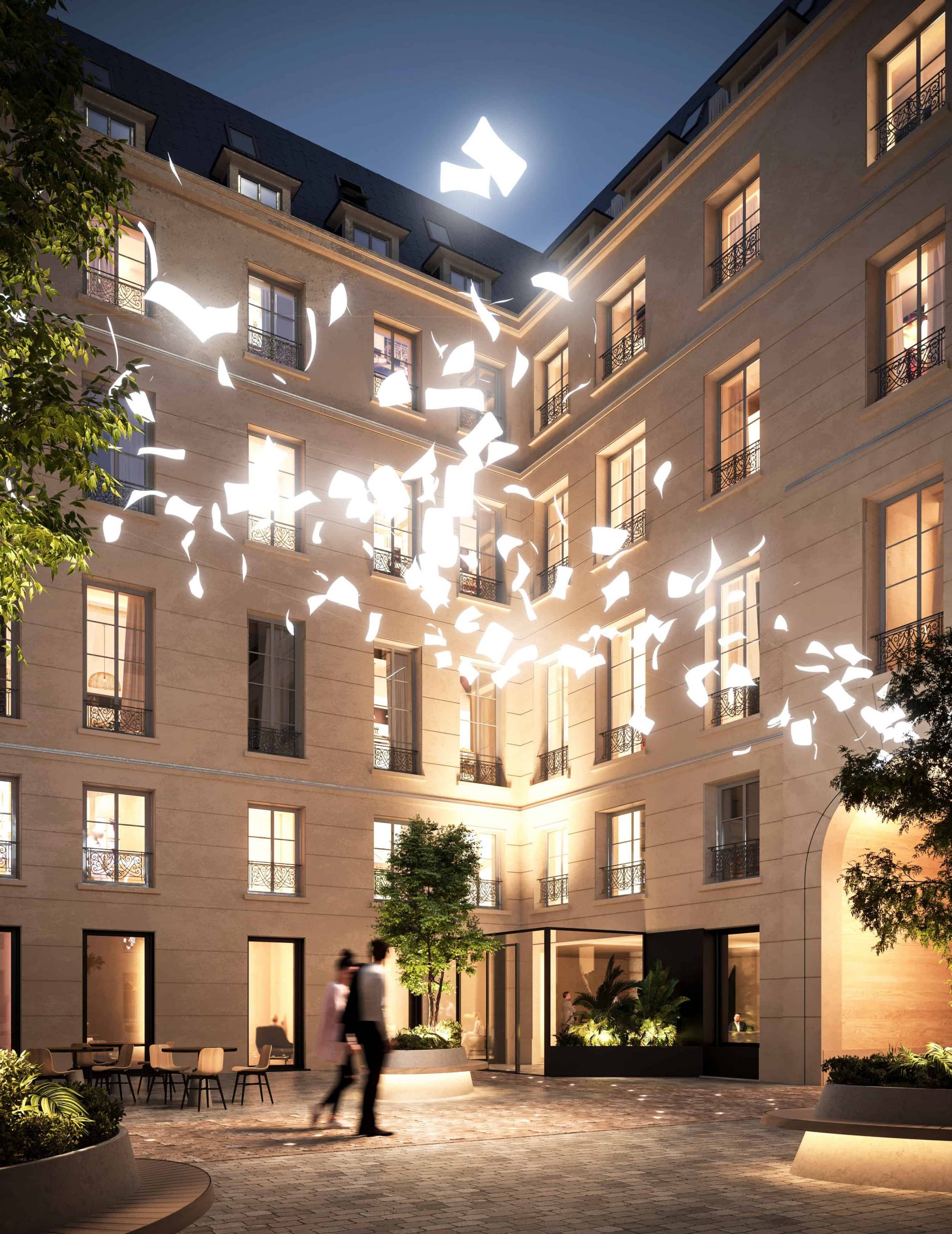 éclairage qui apparaît à la tombée du jour, qui illumine sublimement la cour et qui, la journée se noie dans les façades.